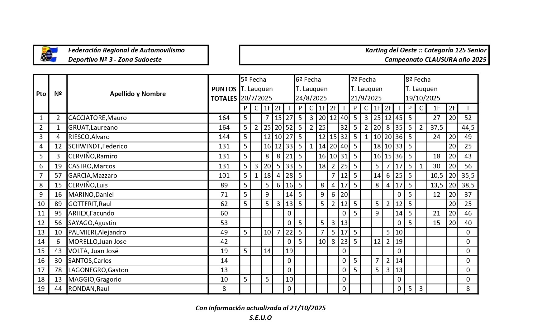 El trenquelauquense Valentín Luján sigue líder del Clausura en la clase Directos 125cc Menores, acumulando 161 puntos y aventajando por 5,5 puntos a su mas inmediato perseguidor, Pedro Mariezcurrena que suma 155,50. Tercero esta Joaquín Scansi Garcia con 131.