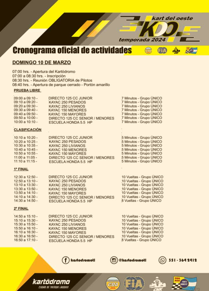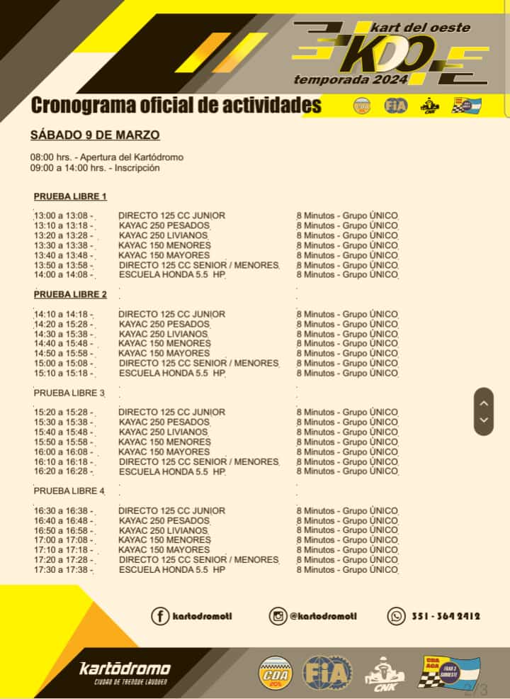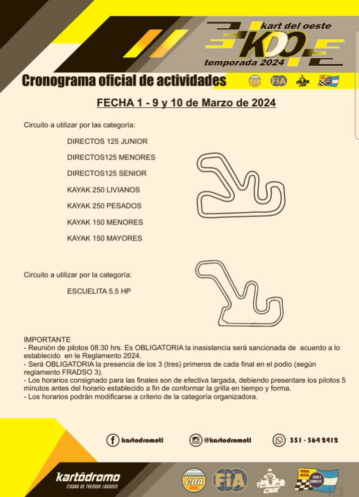 Para los días sábado 9 y domingo 10 de marzo próximo, se anuncia la primera fecha de los campeonatos anuales del Karting del Oeste, temporada 2024.