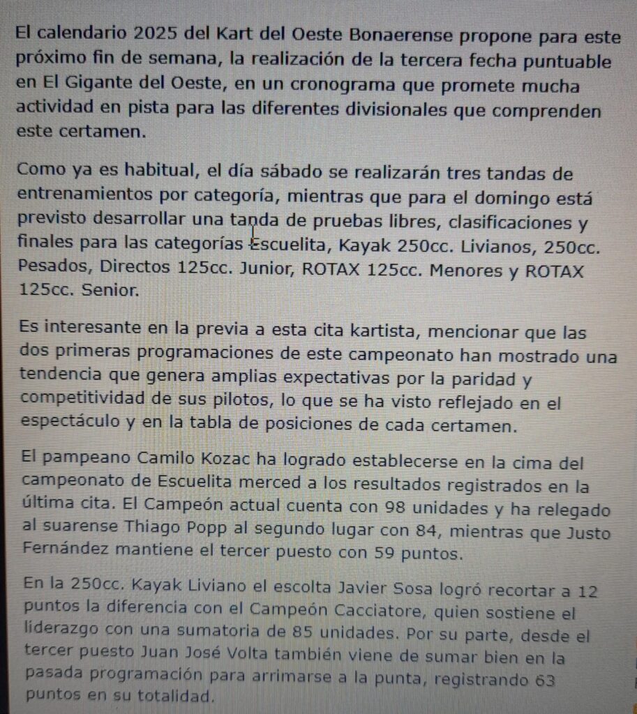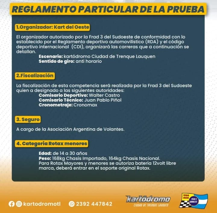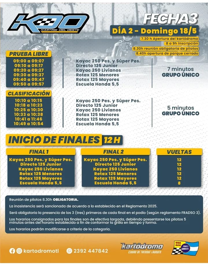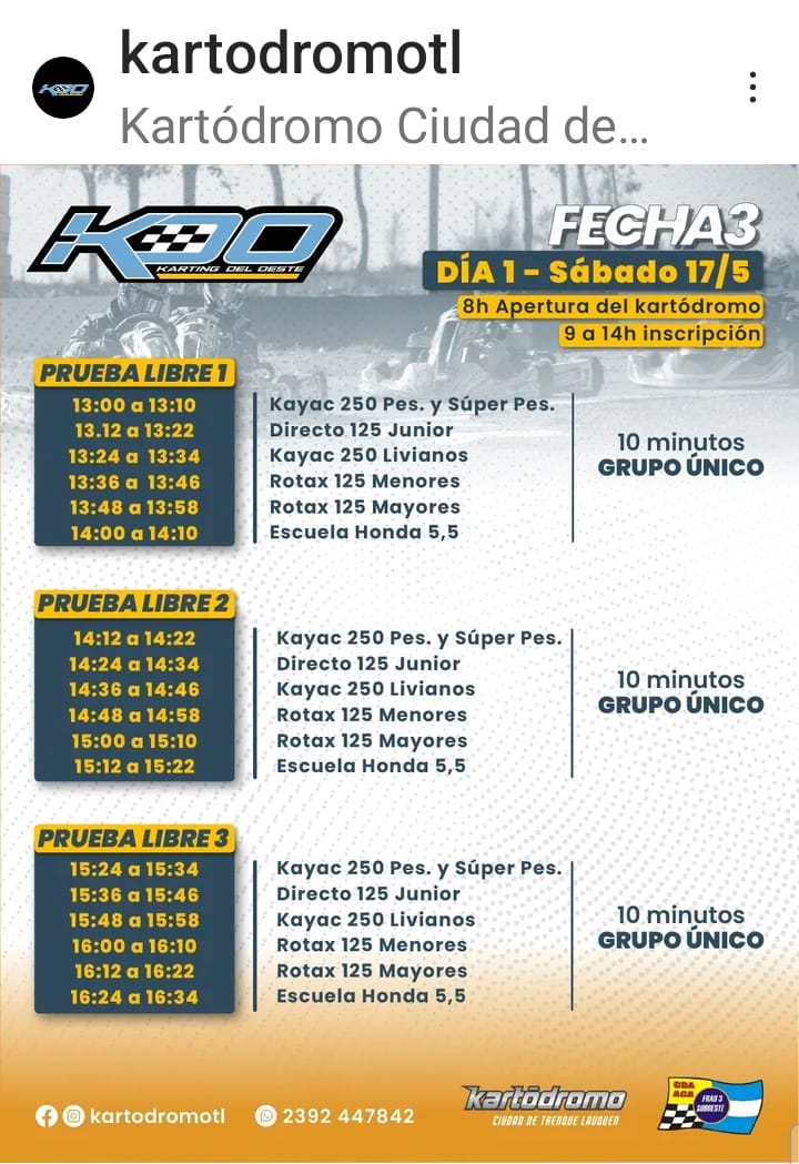Sera la tercera del certamen 2025 del Karting del Oeste, en el trazado del Kartodromo Ciudad de Trenque Lauquen, este sábado 17 y domingo 18 de mayo.