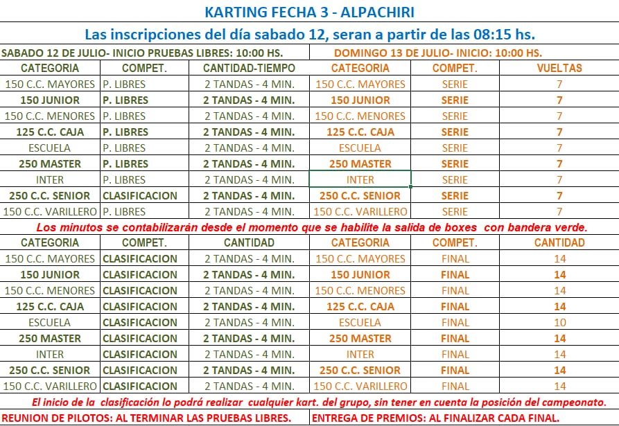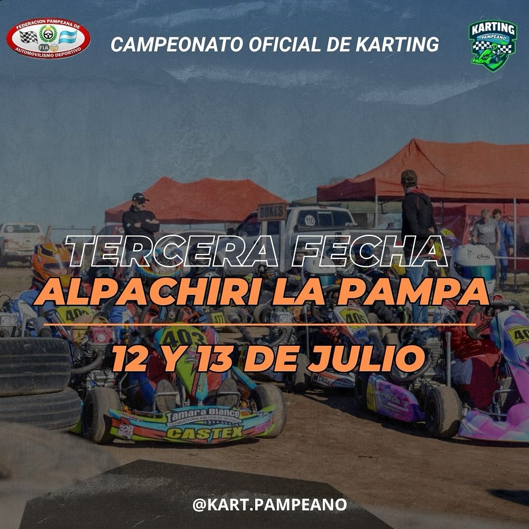La tercera fecha del torneo 2025 del Karting Pampeano, ya tiene fecha y lugar. La cita mencionada sera 12 y 13 de julio en la localidad de ALPACHIRI! (Récorda llevar abrigo). Múltiples categorías para poder disfrutar el espectáculo.
