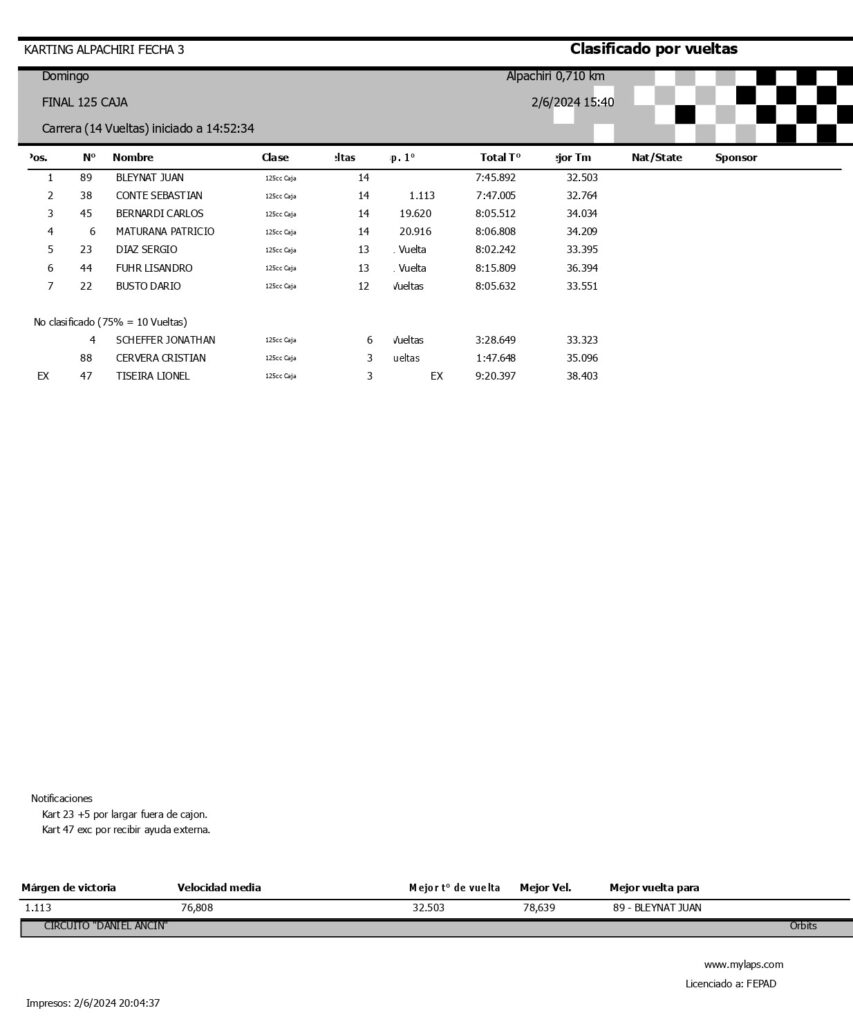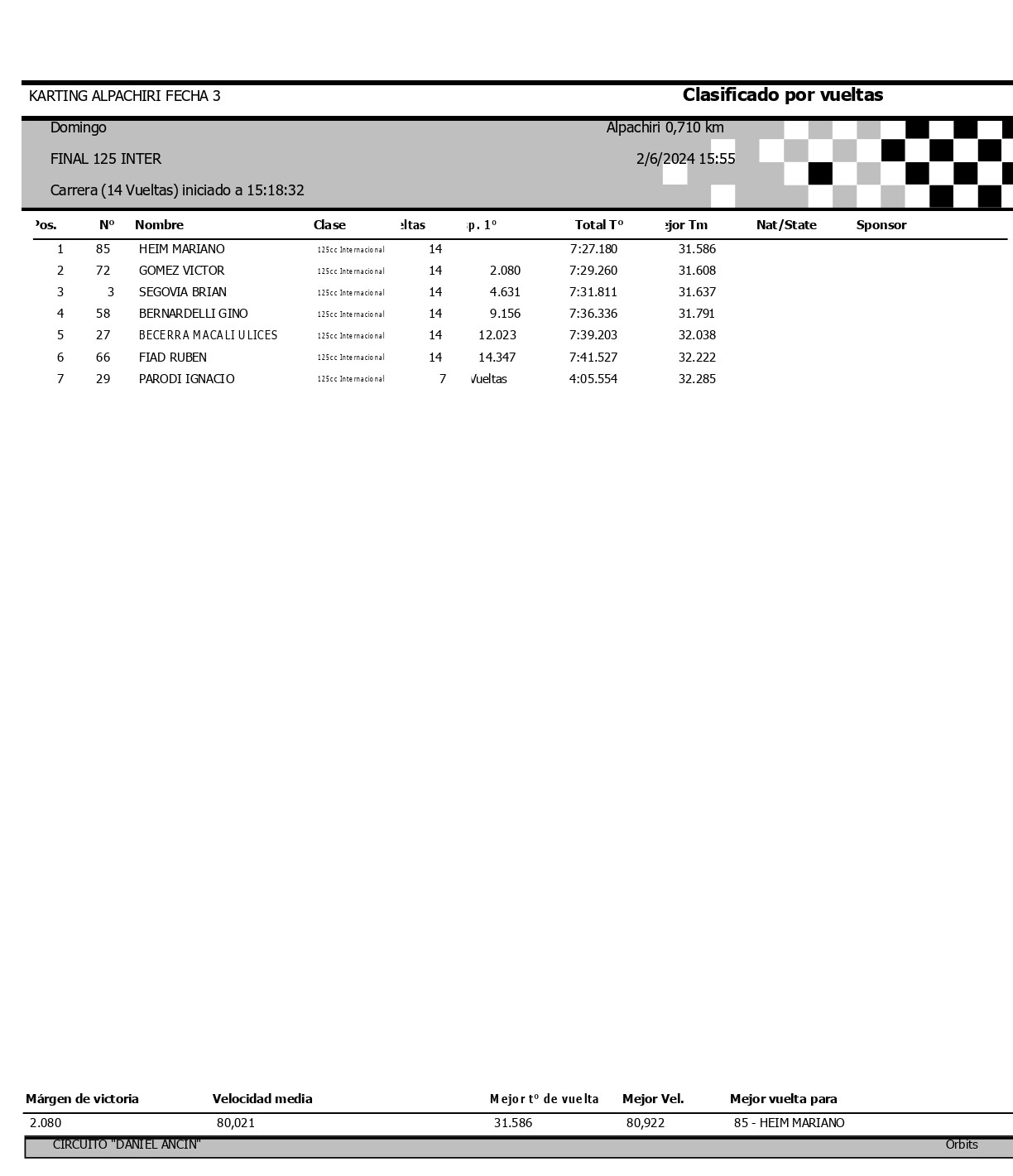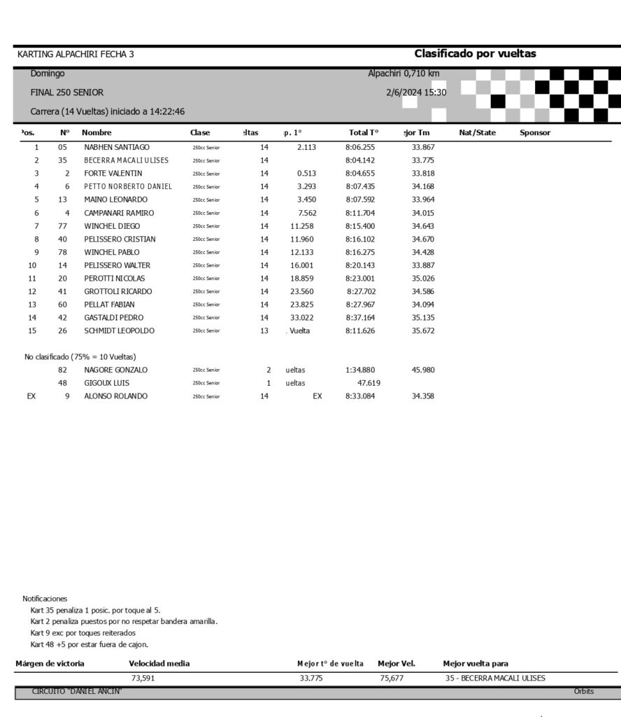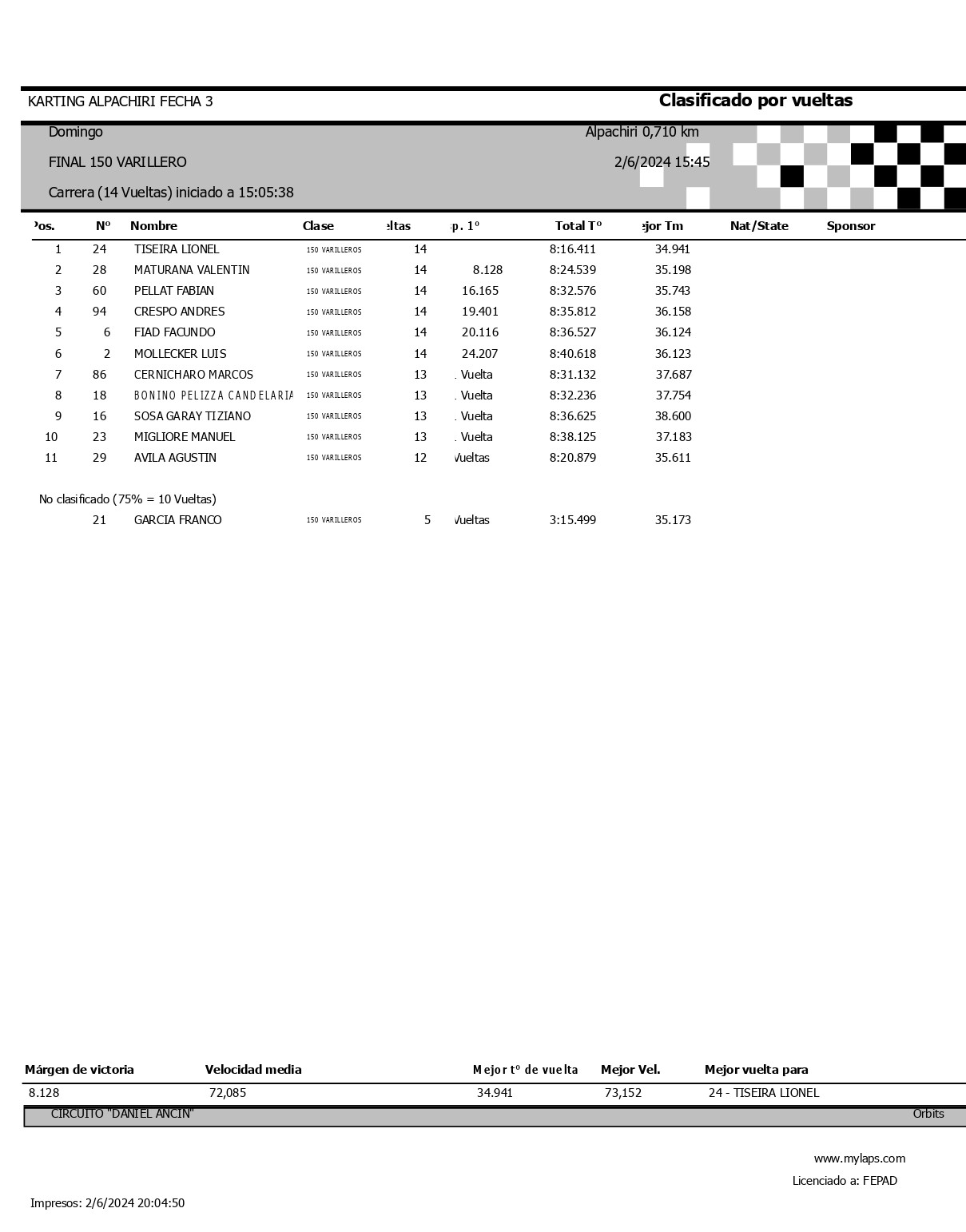Lionel gano la final disputada a 14 vueltas con un tiempo de 8m16s411, a un promedio de 72,085 km/h. Tiseira además logro el record de vuelta en 34s941, a 73,152 km/h.