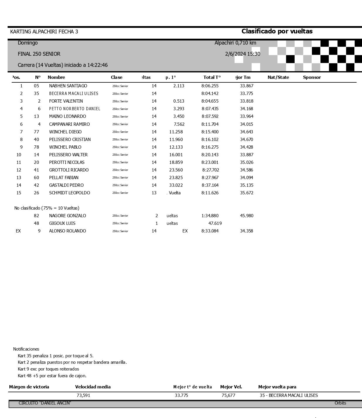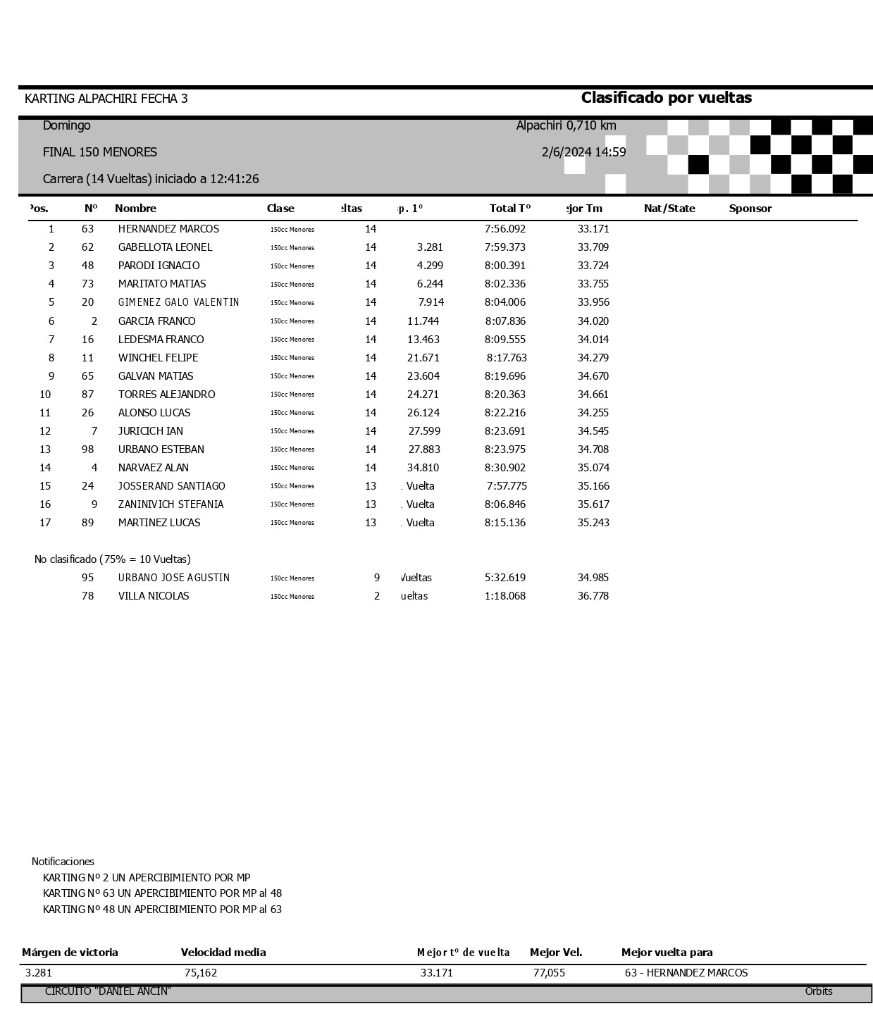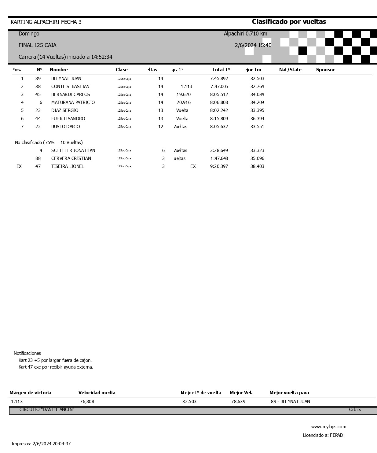 Lionel gano la final disputada a 14 vueltas con un tiempo de 8m16s411, a un promedio de 72,085 km/h. Tiseira además logro el record de vuelta en 34s941, a 73,152 km/h.