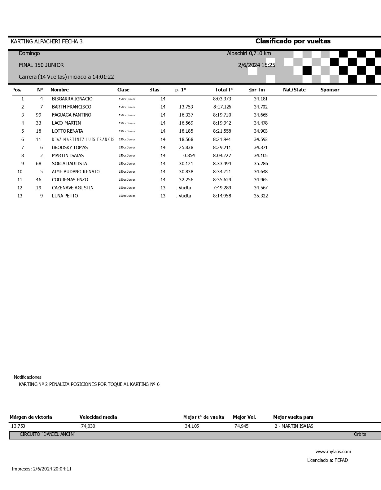 | 15 | 16 | SOSA TIZIANO | 12.0 |