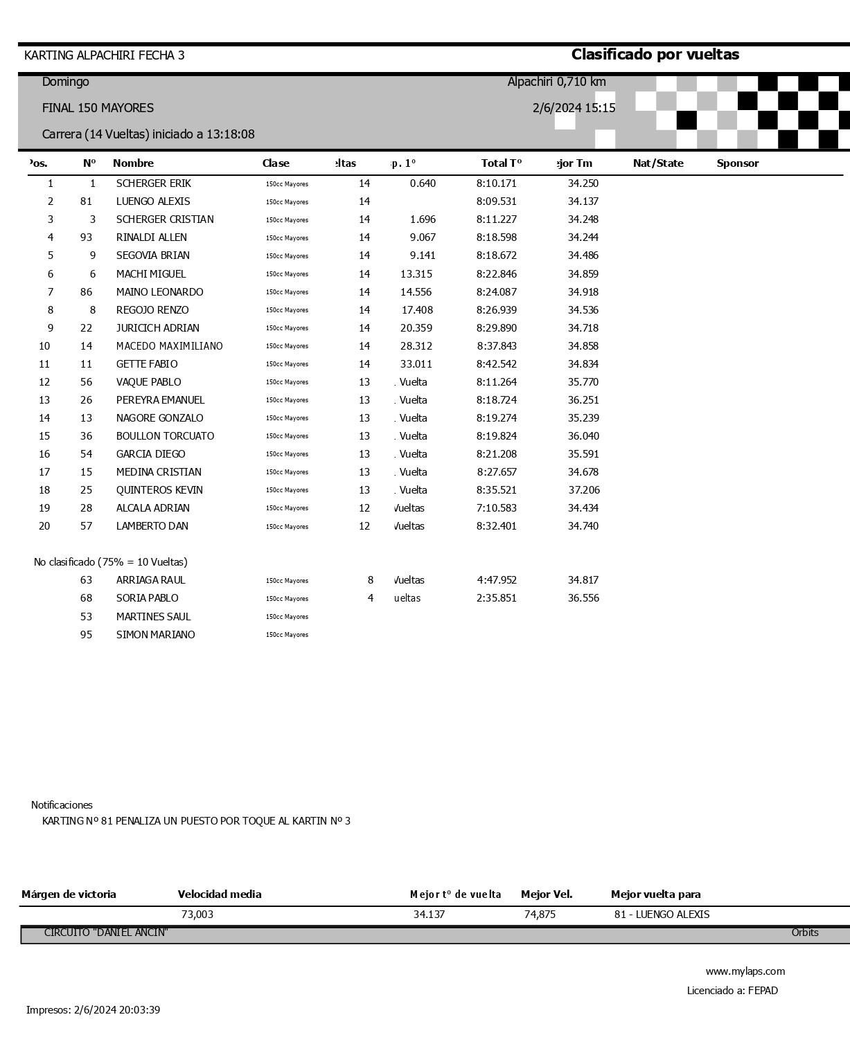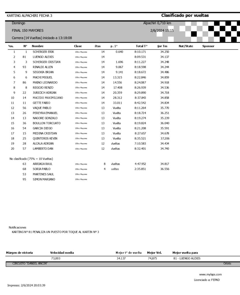 Lo escoltaron Valentín Maturana a 8s128 y tercero quedo Fabián Pellat a 16s165, siendo cuarto Andrés Crespo y quinto Facundo Fiat.