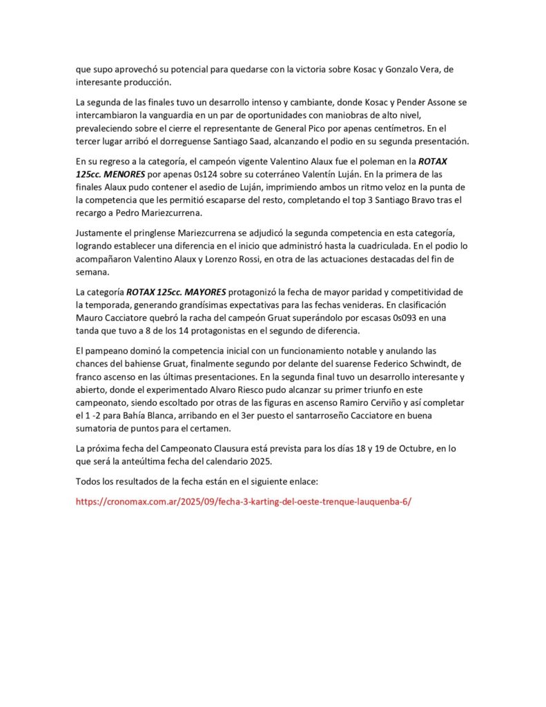 | 4 | 44 | MARIEZCURRENA Pedro | 12 | 10:11.116 | 4.306 | 0.001 | +1 puesto por toque al kart 25 |