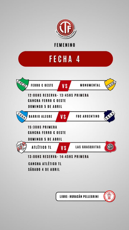 ACTA NÚMERO SIETE: La Liga Trenquelauquense de Fútbol, sita en San Martín 119 de la ciudad de Trenque Lauquen, con los Sres. Presidente Dario Morales, Secretario Franco A. Benini, Tesorero Federico Siri. Se comunica programa de la fecha 4 del torneo Liguilla 2026 denominado “150 ANIVERSARIO DE LA CIUDAD” auspiciado por al Municipalidad de Trenque Lauquen