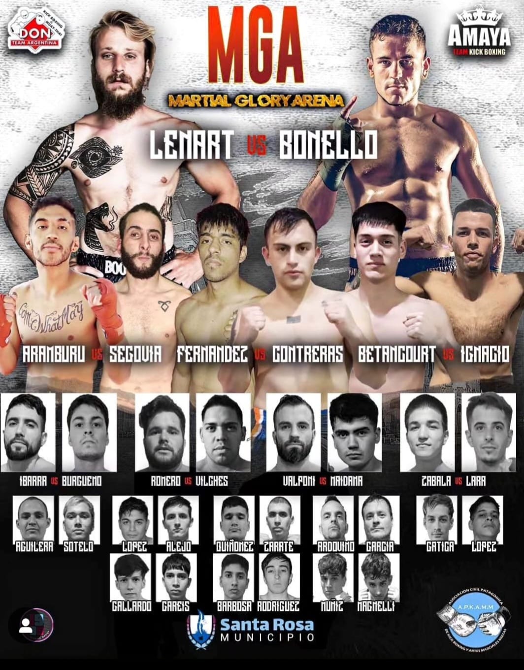 El encuentro contará con 16 combates, incluyendo un doble fondo profesional que presentará un enfrentamiento destacado entre David «Vikingo» Lenart, santarroseño recién llegado de Holanda, y Maximiliano Bonello de Trenque Lauquen. Las entradas estarán disponibles en la puerta del Club y también pueden adquirirse anticipadamente en la conferencia de prensa de hoy.