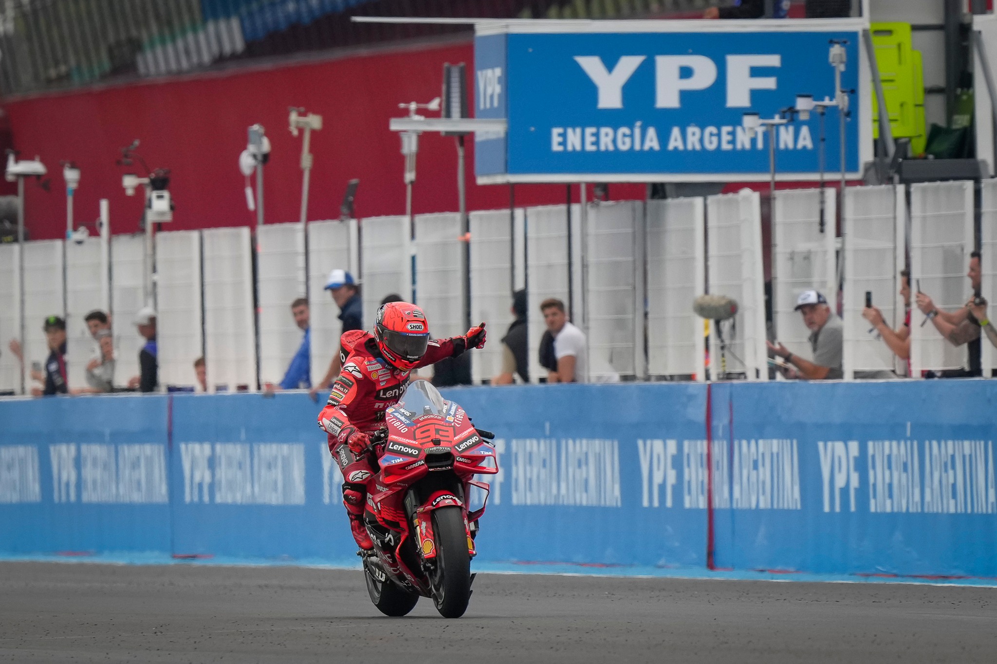 | Desde 2019 Marc Márquez (Ducati-Ducati Lenovo Team) no corría en nuestro país pero el máximo ganador del Gran Premio YPF de Argentina hoy logró estirar un poco más su hegemonía en el Circuito Internacional de Termas conquistando su sexta “pole position” y rompiendo nuevamente su propia marca de vuelta más veloz en la historia del trazado. Esta mañana, durante la sesión Práctica Libre 2, fue el único momento en el que el español no apuntó su nombre en lo más alto del clasificador, pero la planilla igualmente mostró a un Márquez al frente ya que Alex (Ducati-BK8 Gresini Racing MotoGP) fue el dominador la tanda superando a su hermano por apenas 87 milésimas y marcando un poco la pauta de lo que iba a ser el sábado con los dos españoles escapados del resto del pelotón. En clasificación Marc fue el dominador, estableciendo un nuevo récord de pista y convirtiéndose en el único hombre del fin de semana en bajar el 1m37s, con un registro de 1m36.917/1000, tres décimas menos que lo conseguido ayer. Alex Márquez fue segundo a dos décimas mientras que Johann Zarco (Honda-Castrol Honda LRC) fue el único piloto que pudo colarse entre las Ducati en el último cajón de la primera fila. La Carrera Sprint fue otro show de los Márquez. Marc tuvo una partida perfecta y se escapó al frente seguido de su hermano. Ni siquiera Francesco Bagnaia (Ducati-Ducati Lenovo Team), que le arrebató el tercer lugar a Zarco en el arranque, pudo seguirles el ritmo a los de punta; una vez que Alex logró un margen respecto a “Pecco”, cesó la presión sobre el líder y los hermanos Márquez se encaminaron hacia la bandera a cuadros, repitiendo el 1-2-3 de la Carrera Sprint y la Final en Tailandia. Esta fue la tercera victoria consecutiva de Marc Márquez en una Sprint -contando la última fecha de 2024- y que ahora le permite acrecentar su ventaja al frente del torneo a 11 unidades por delante de Alex y 19 respecto de «Pecco». |