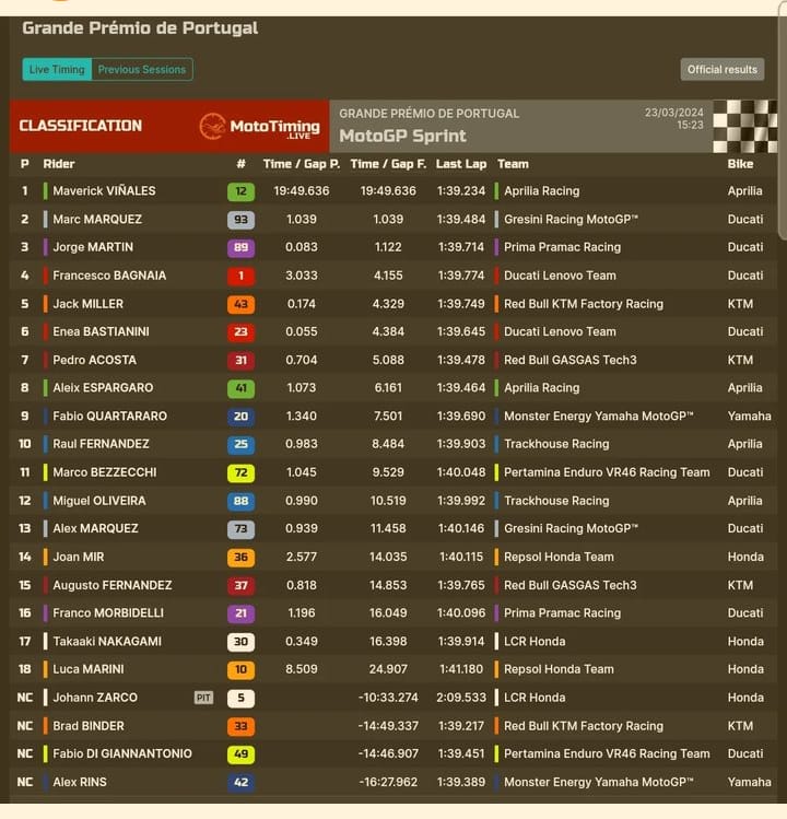 La carrera Sprint del MotoGP en Portugal fue un verdadero espectáculo, una montaña rusa llena de emociones. Maverick Viñales puso la bandera española en lo más alto luego de llevarse la victoria a bordo de su Aprilia. Sus compatriotas Marc Márquez y Jorge Martín hicieron lo propio y lo escoltaron en el podio.