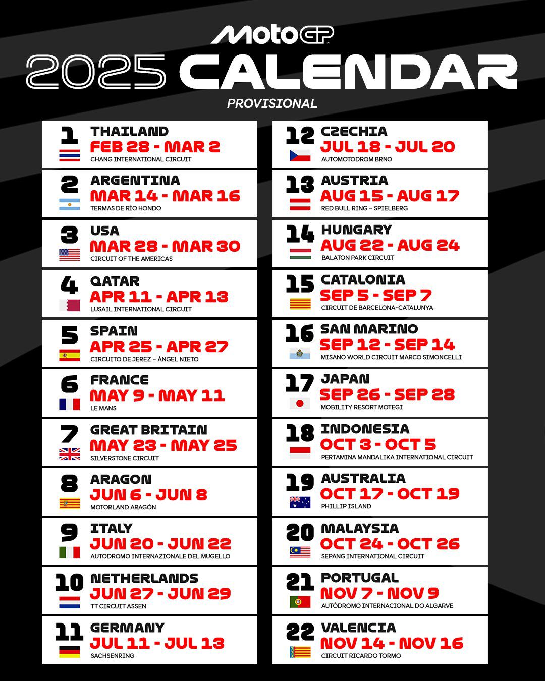 Se dio a conocer por parte del Moto GP Internacional el calendario provisional 2025.