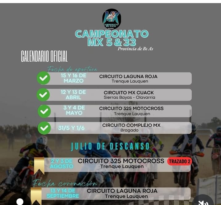 No habrá actividad de motocross hasta los primeros días del mes de agosto. El certamen rutas 5 y 33 se reanudara el 5 y 6 de agosto, en el trazado 2 del circuito 325 en Trenque Lauquen.