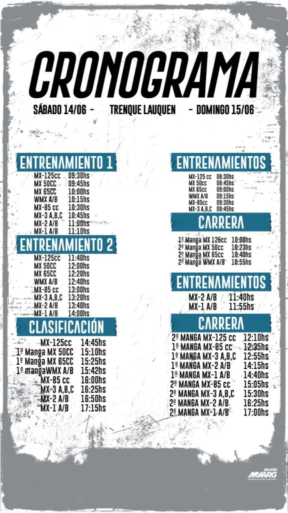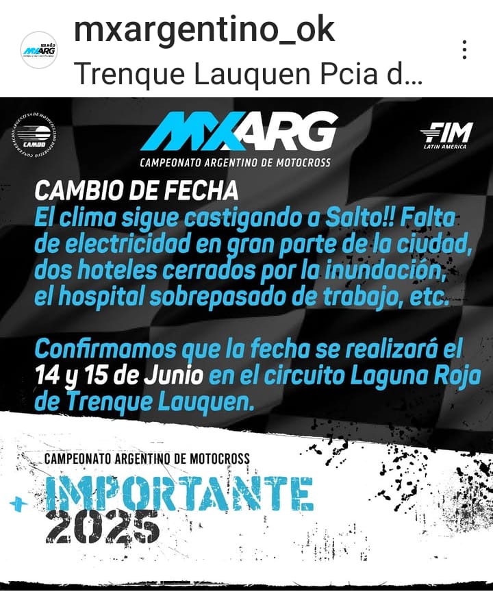 Entonces la 3ra fecha del Campeonato Argentino de Motocross se realizará nuevamente en Trenque Lauquen, será los días 14 y 15 de junio, pero en esa oportunidad se utilizará el circuito de la “ciudad”, se correrá en el Laguna Roja.