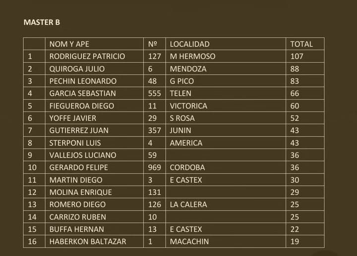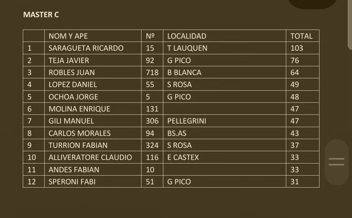 En la Master C lidera Saragueta con 103 puntos, siendo séptimo el pellegrinense Manuel Gili con 47.