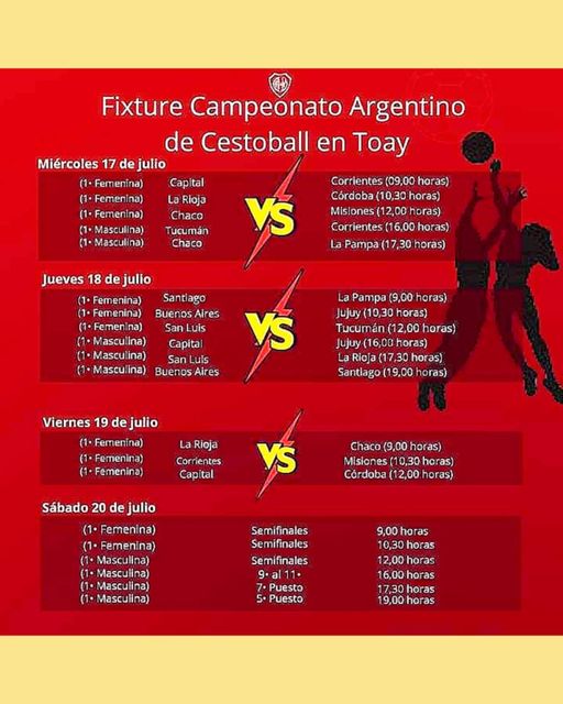 El primer partido en Toay, se llevó a cabo este miércoles 17 a las 9 horas en Primera Femenina entre Capital y Corrientes, siguiendo con el resto de los cotejos, uno de ellos en Primera Masculina entre La Pampa y Chaco a las 17,30 horas. La inauguración oficial del Campeonato se realizó en el Club Estudiantes a las 21,15 horas. Se adjunta fixture de los partidos que se jugarán en Guardia del Monte. La entrada es libre y gratuita.