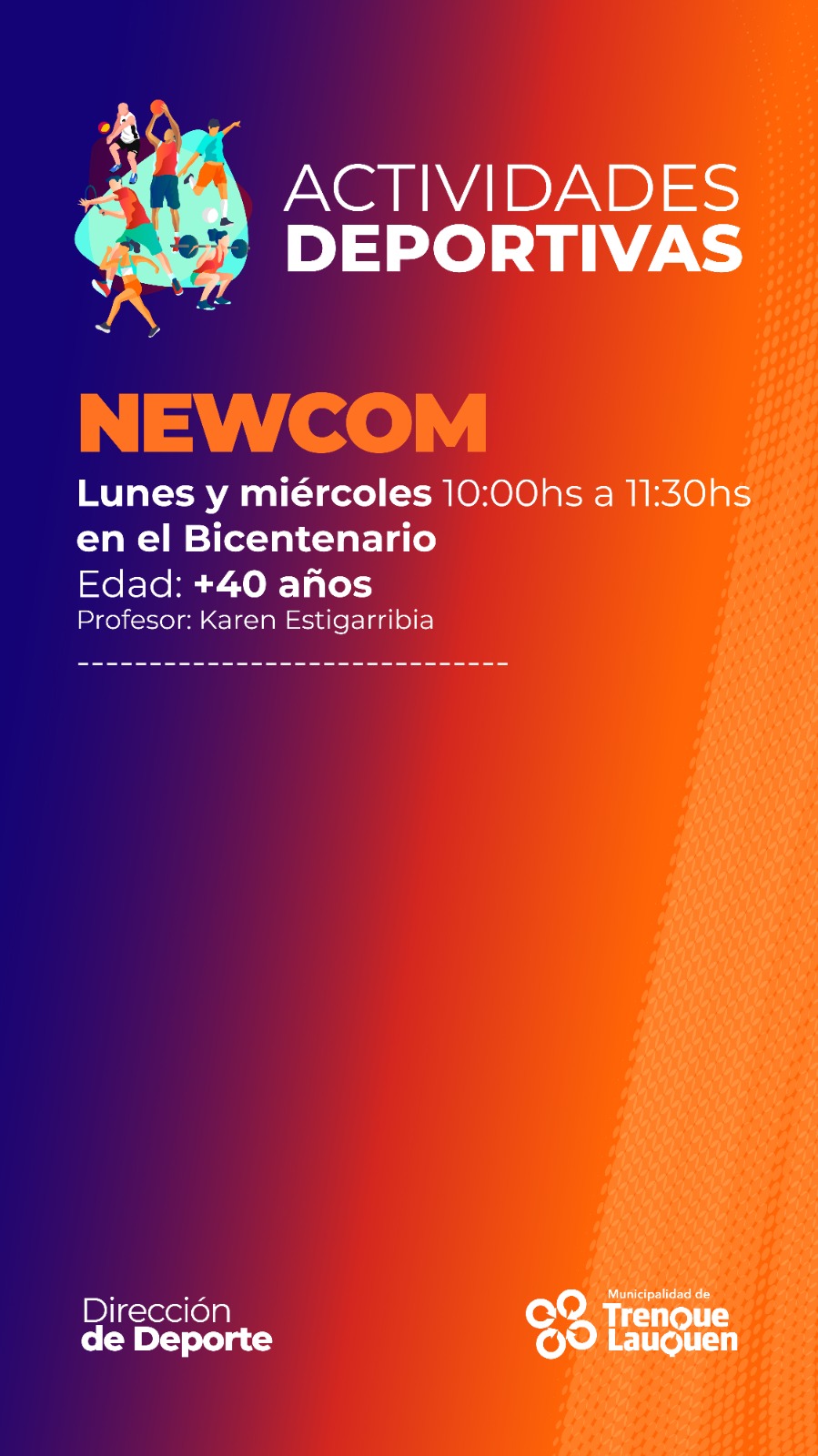La dirección de Deporte municipal informa los días y horarios de funcionamiento de la actividad de Newcom +40 que se dicta en el gimnasio del Bicentenario (barrios Aramendi y Bicentenario): lunes y miércoles de 10 a 11.30.