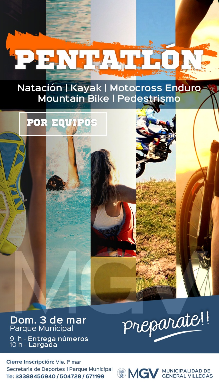 Se realizo este pasado domingo 3 una prueba de Pentatlon en Bolivar. Fueron 500 metros de natacion, 4 kms de Kayak, 15 kms de Motoross enduro, 16 ksm de Moutain bike y finalizaron con 66 kms de pedestrismo.