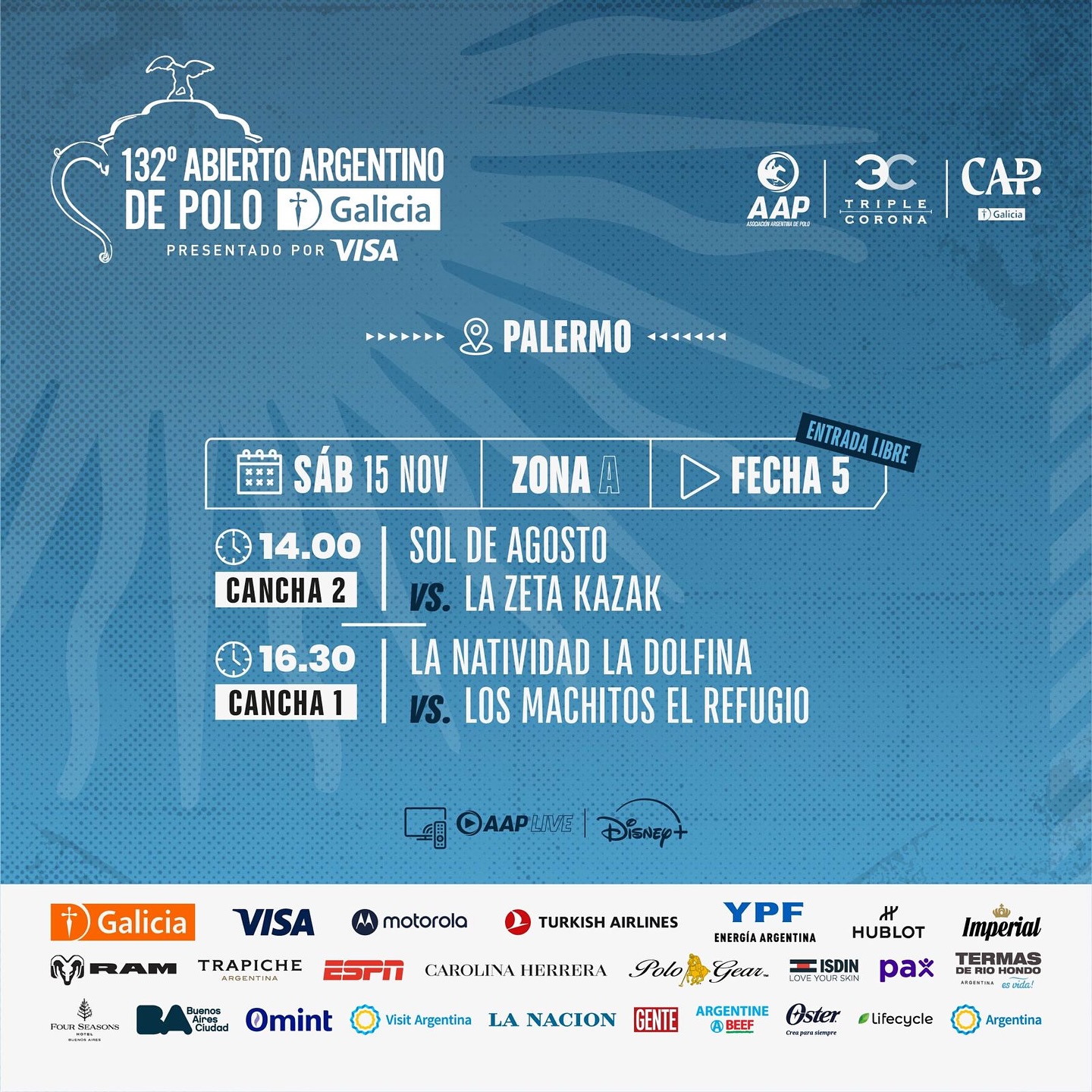 El sábado 15 y el domingo 16/11, en el Campo Argentino de Polo Galicia en Palermo se disputarán las fechas 5 y 6 del máximo certamen mundial de nuestro deporte: el 132° Abierto Argentino de Polo Galicia presentado por Visa, que es protagonizado por los 10 mejores equipos del mundo, que ostentan entre 31 y 40 goles de valorización, quienes están ubicados en dos zonas de cinco que se enfrentan a la americana, con final entre los mejores de cada grupo.
