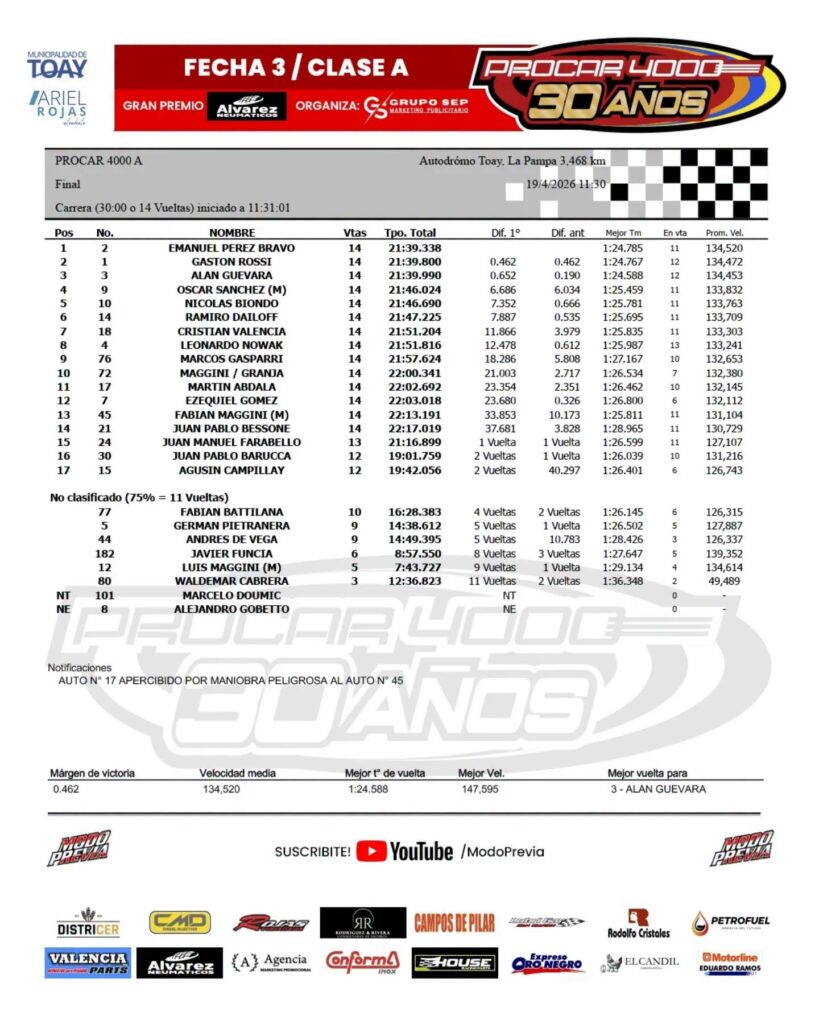 En el tramo final de la carrera se juntaban los tres de adelante y Pérez Bravo con mucho oficio defendía el liderazgo para llegar al final como victorioso, alzándose con el GP Álvarez Neumáticos, siendo el primer ganador en la historia del Procar en La Pampa. Segundo un Gaston Rossi muy desgastado físicamente por algunos temías de salud y tercero un recuperado y aguerrido Alan Guevara.