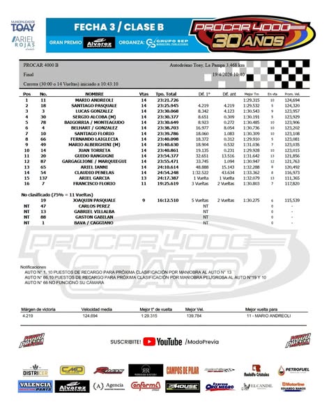 La próxima competencia del Procar 4000 Clase B será en el Roberto Mouras de La Plata 31 de mayo.