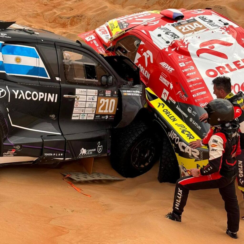 El piloto argentino de Overdrive estaba teniendo su mejor etapa en el Abu Dhabi Desert Challenge, pero sufrió un vuelco y luego se encontró con el vehículo de Martin Prokop parado en una duna y no pudo evitar el choque. Aun así, sigue en carrera para seguir sumando puntos en el Campeonato Mundial de Rally Raid.