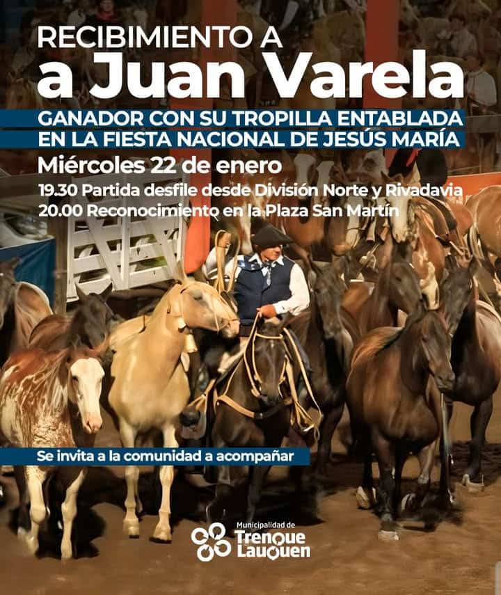 La Municipalidad de Trenque Lauquen realizará en la tarde de miércoles 22 de enero un reconocimiento al trenquelauquense Juan Varela, ganador con su tropilla entablada en la Fiesta Nacional de Jesús María.