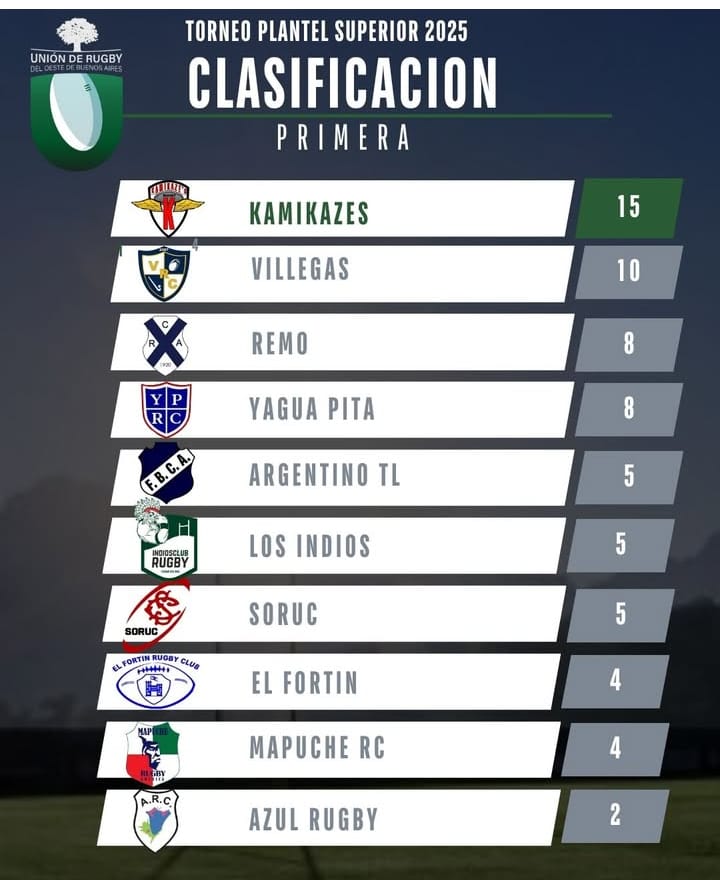 Y en la Intermedia, la clasificación esta liderada tambien por Kamikazes con 14, escoltado por el FBC Argentino, Mapuche y Villegas Rugby con 10,