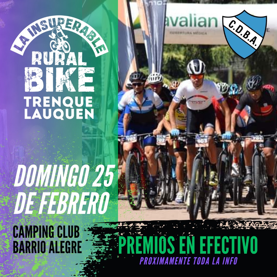 Organizado por el Club Barrio Alegre de Trenque Lauquen, y con la presencia asegurada de más de 150 ciclistas de la región y de La Pampa, se realizará este próximo domingo 25 de febrero, la 4ta. Edición de la prueba de Rural Bike La Insuperable. La cita se iniciara a las 11 horas y hay numerosas categorías, los participantes deberán retirar el kit de inscripción el día domingo de 8,30 a 10,30 hs.