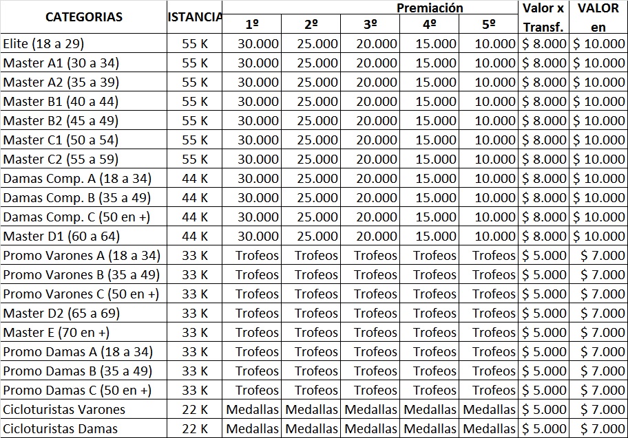 Premiación en efectivo para todas las categorías competitivas, copas para las categorías promocionales. Medallas para los Cicloturistas. Medallas Finisher para todas/os las/os participantes.