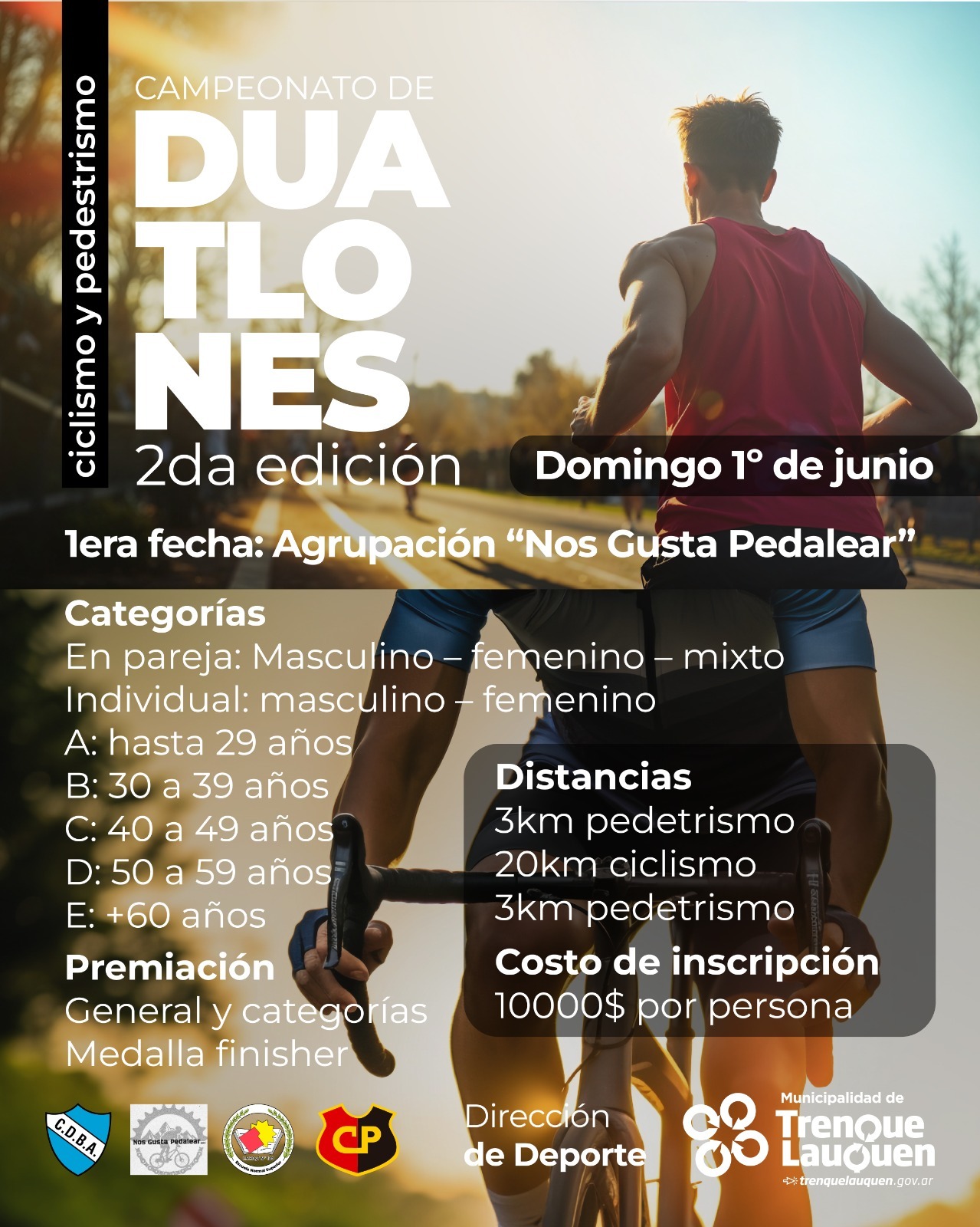 El proximo DOMINGO 1º DE JUNIO arrancará la SEGUNDA EDICIÓN del CAMPEONATO DE DUATLONES en Trenque Lauquen. Cuatro fechas de DESAFÍO, VELOCIDAD y RESISTENCIA combinando CICLISMO y PEDESTRISMO. Competí en modalidad INDIVIDUAL o en PAREJAS y sumate a esta experiencia única. INSCRIBITE y preparate para superar tus límites.