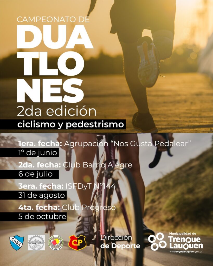 El próximo domingo (1 de junio) se realizará en Trenque Lauquen la primera fecha de la segunda edición del Campeonato de Duatlones (Ciclismo y Pedestrismo), organizado por la dirección de Deporte del municipio junto a la Agrupación “Nos Gusta Pedalear, el Club Barrio Alegre, el Instituto Superior de Formación Docente nº 144 y el Club Progreso.