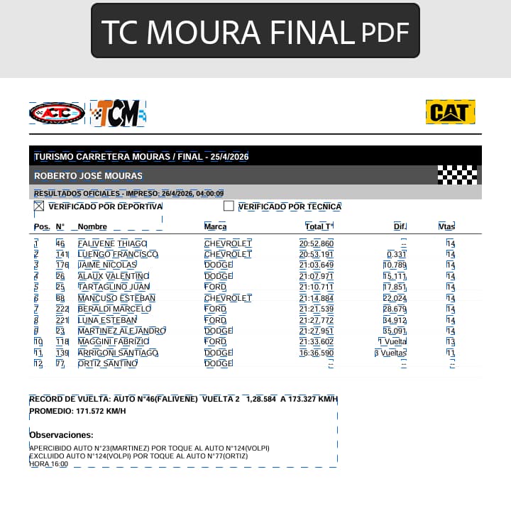 Thiago Falivene le arruinó la fiesta a Francisco Luengo, que había ganado todo hasta la final, pero una vez allí, el piloto de San Antonio de Areco, con una muy linda maniobra puso por delante a su Chevrolet, que le atiende el RUS MED Team, para conseguir la primera victoria en la categoría. Cuatro fechas y cuatro ganadores diferentes en el TC Mouras, una categoría más que competitiva.