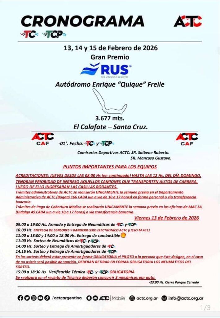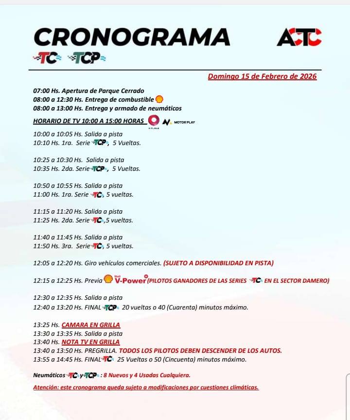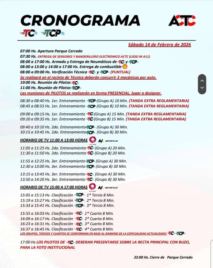 El TC Pista tendrá sus entrenamientos en la mañana del sábado y luego, por la tarde, tocará el turno de la primera clasificación del año. El domingo, bien temprano, se disputarán las series y al mediodía tendrá lugar la primera final del 2026.
