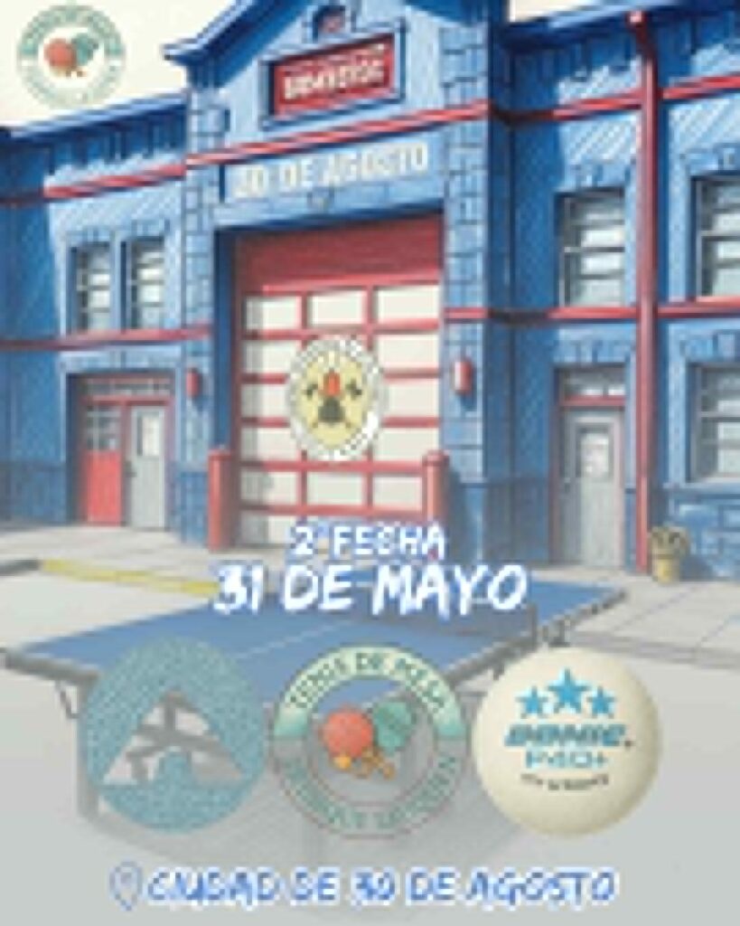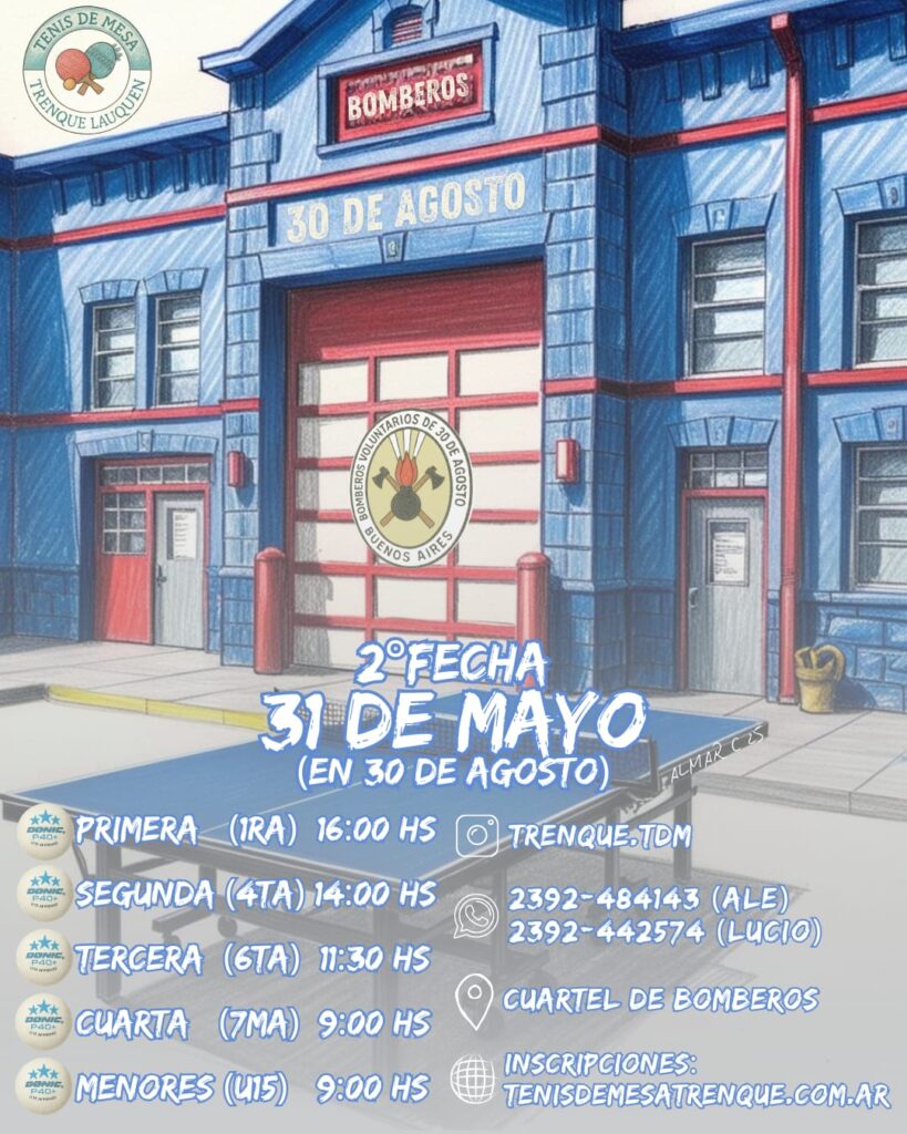 El 31 de mayo llega la segunda fecha de nuestra liga, con una cita en la ciudad de 30 de Agosto. Por segundo año consecutivo, se realizará un torneo a beneficio de Bomberos Voluntarios.,ORGANIZADO por Tenis de Mesa Trenque Lauquen.