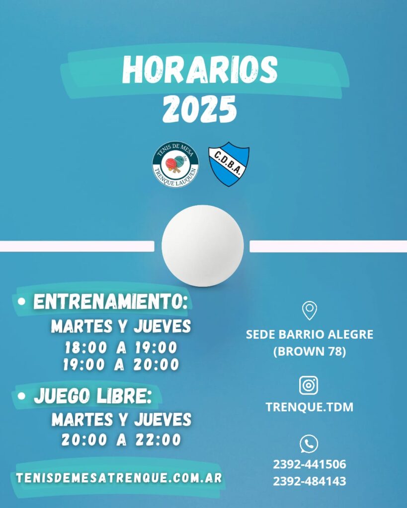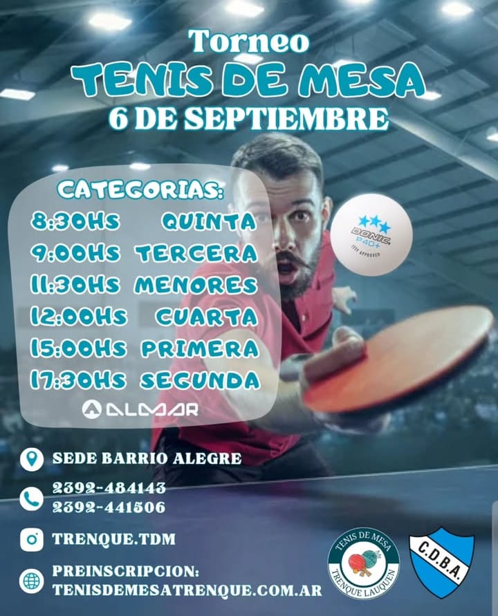 El próximo sábado 6 de septiembre, el Club Barrio Alegre de Trenque Lauquen será sede de un nuevo torneo de tenis de mesa, que promete reunir a jugadores locales y de distintas ciudades de la región![]()