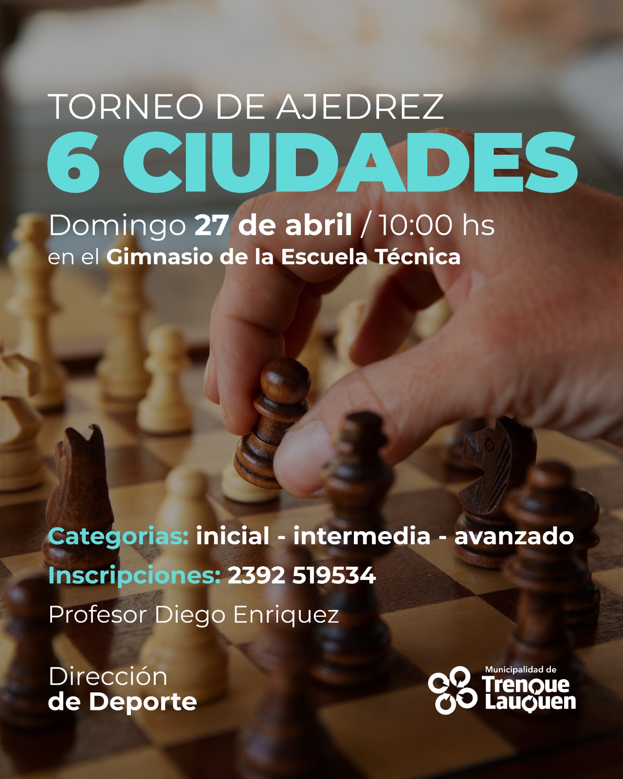 El domingo 27 de abril, y en adhesión a los festejos por el 149º aniversario de Trenque Lauquen se realizará el Torneo de Ajedrez 6 Ciudades en el gimnasio de la Escuela de Educación Técnica, organizado por la dirección de Deporte del municipio.
