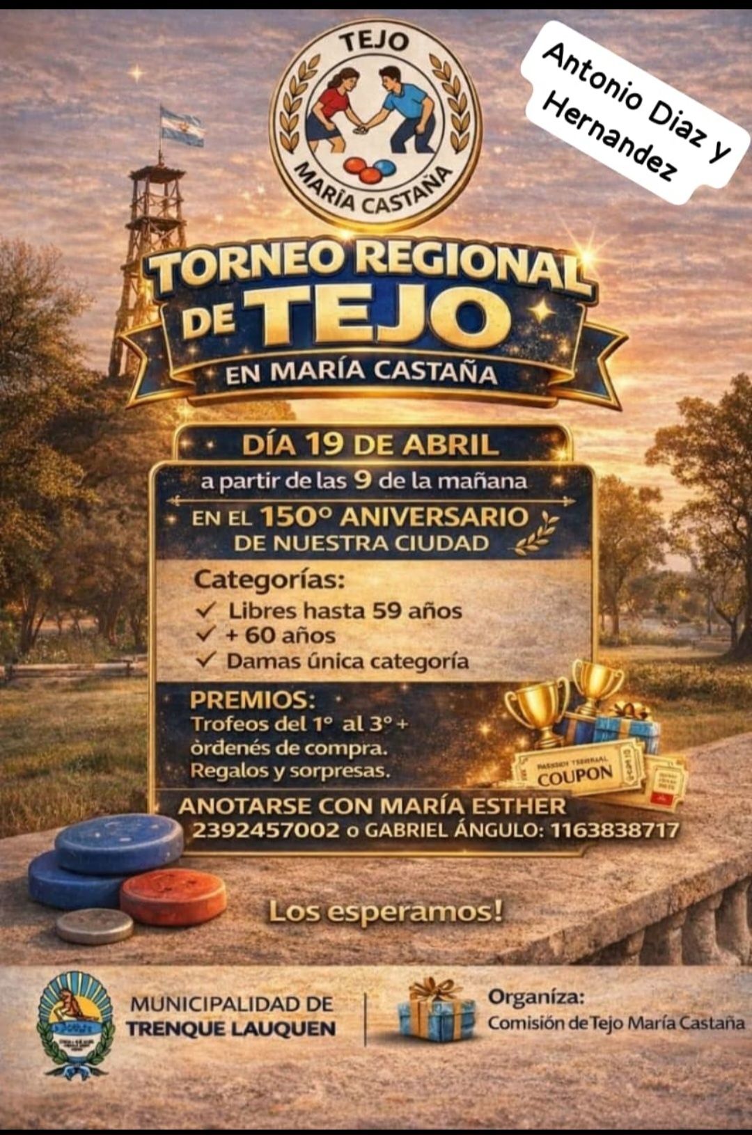 Este domingo (19) a partir de las 9 h en el complejo María Castaña, ubicado en Antonio Díaz y Hernández, se llevará a cabo un Torneo Regional de Tejo, en el marco de los festejos y actividades por el 150º aniversario de la fundación de Trenque Lauquen.