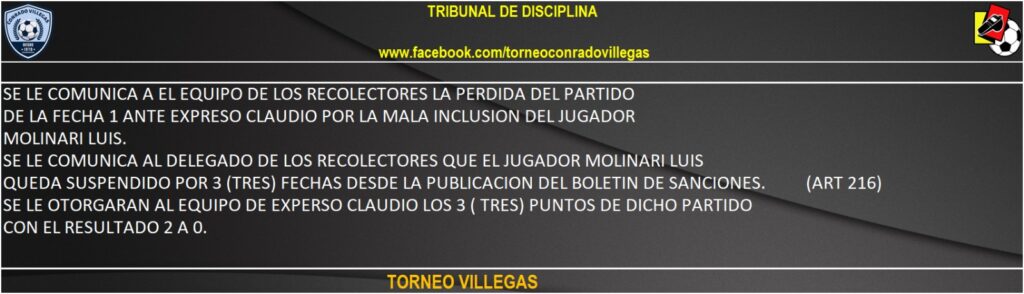 TORNEO CONRADO VILLEGAS EL FUTBOL CON VIOLENCIA AGREDIERON A UN ARBITRO, SUFRIO FRACTURA DE COSTILLAS, HAY DENUNCIA PENAL ESTE MIERCOLES SE REUNE LA COMISION DIRECTIVA DEL TORNEO CON LA DIRECCION DE DEPORTES MUNICIPAL Fuente: Oesteba.- En el Torneo Villegas agredieron...