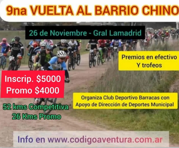 Organizada por el club Deportivo Barracas, mañana (26/11) se habrá de disputar la novena edición de la prueba ciclística “Vuelta al Barrio Chino”, para las categorías Competitivas y Promocionales.