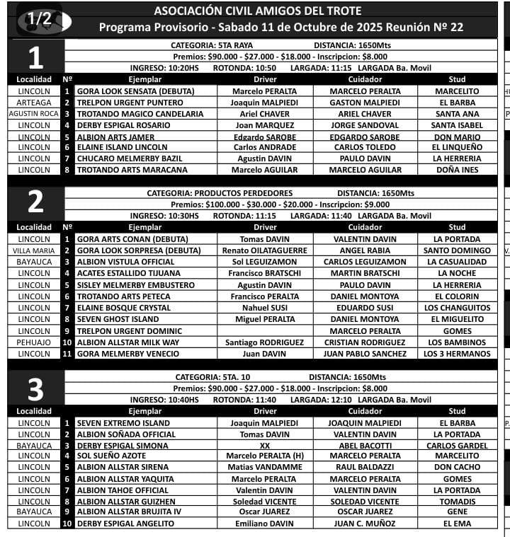 Se anuncio la edición 46 del Nacional de Adultos de la Federación Argentina de trote, a disputarse los días 18 y 19 de octubre, en Lincoln, provincia de Buenos Aires. LA FECHA SE DEBIO POSTERGAR EN UNA SEMANA, pruebas previstas para el 11 y 12, debido al anuncio de mal tiempo.