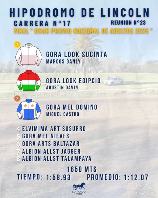 El ejemplar Gora Look Sucinta, con Marcos Ganly, ganó el Gran Premio Nacional de Adultos que se disputó este domingo 18 en la reunión realizada en Lincoln.