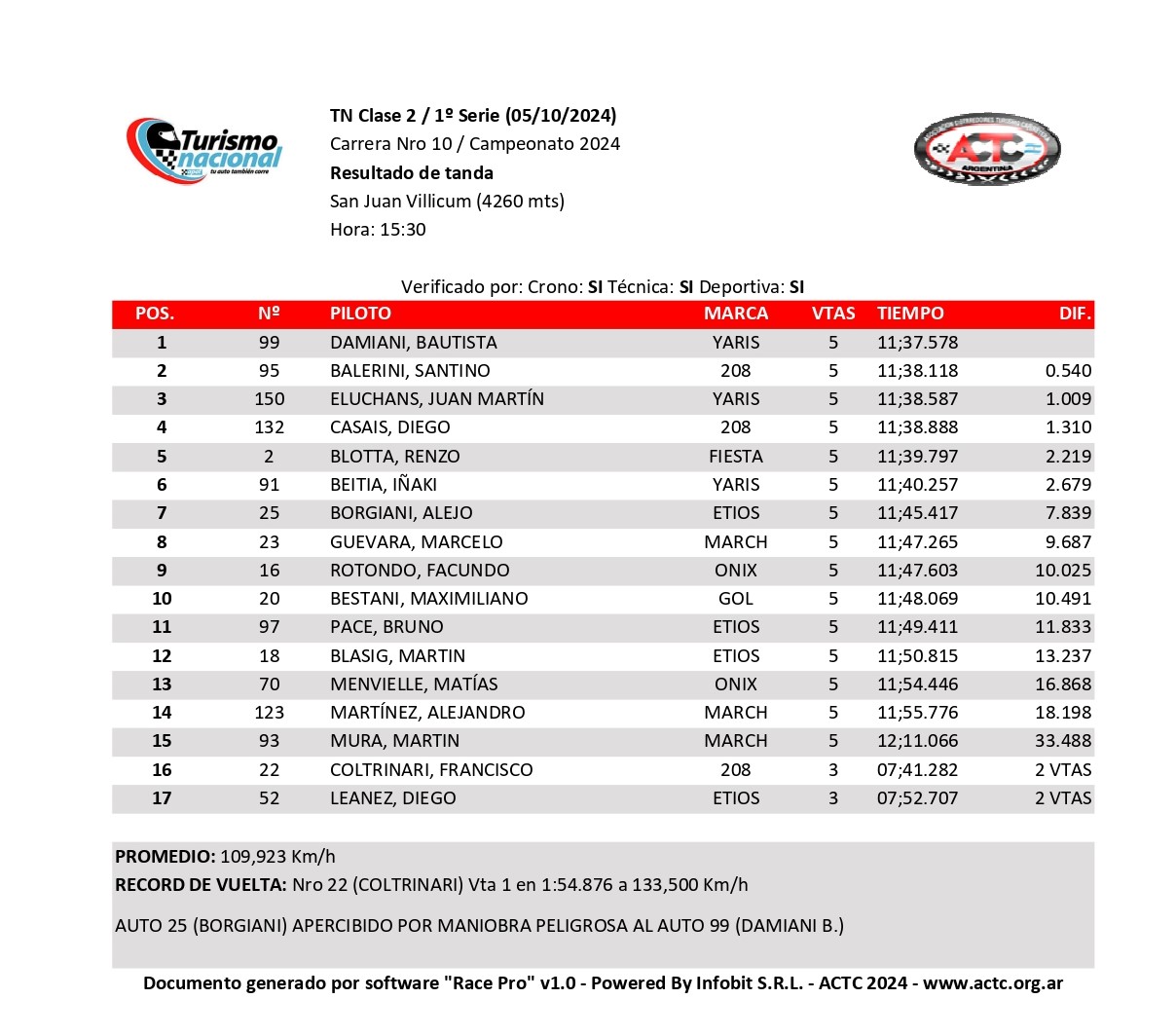 A los mandos del Toyota Yaris atendido por Alquat Motorsport, Bautista Damiani venció en la primera serie disputada por el Turismo Nacional Clase 2 en el Circuito San Juan Villicum (Albardón, San Juan), donde se realiza la décima fecha del Campeonato 2024 en el marco del Gran Premio Pink Power by Dowen Pagio – Copa Banco de San Juan.