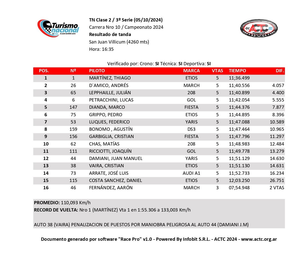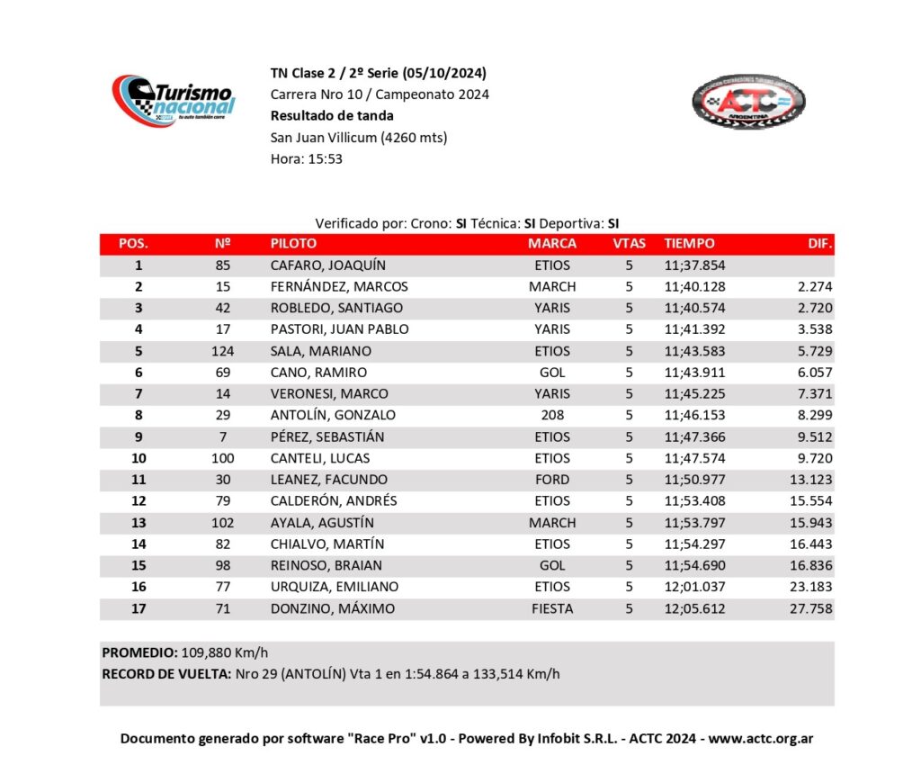 Por séptima vez en la temporada, Thiago Martínez suma nueve puntos en una serie clasificatoria, en este caso, en la tercera cronometrada válida por la décima fecha del Campeonato 2024 de Turismo Nacional Clase 2 que se disputa en el Circuito San Juan Villicum, donde mañana se conocerá al ganador de la prueba final válida por el Gran Premio Pink Power by Dowen Pagio – Copa Banco de San Juan.
